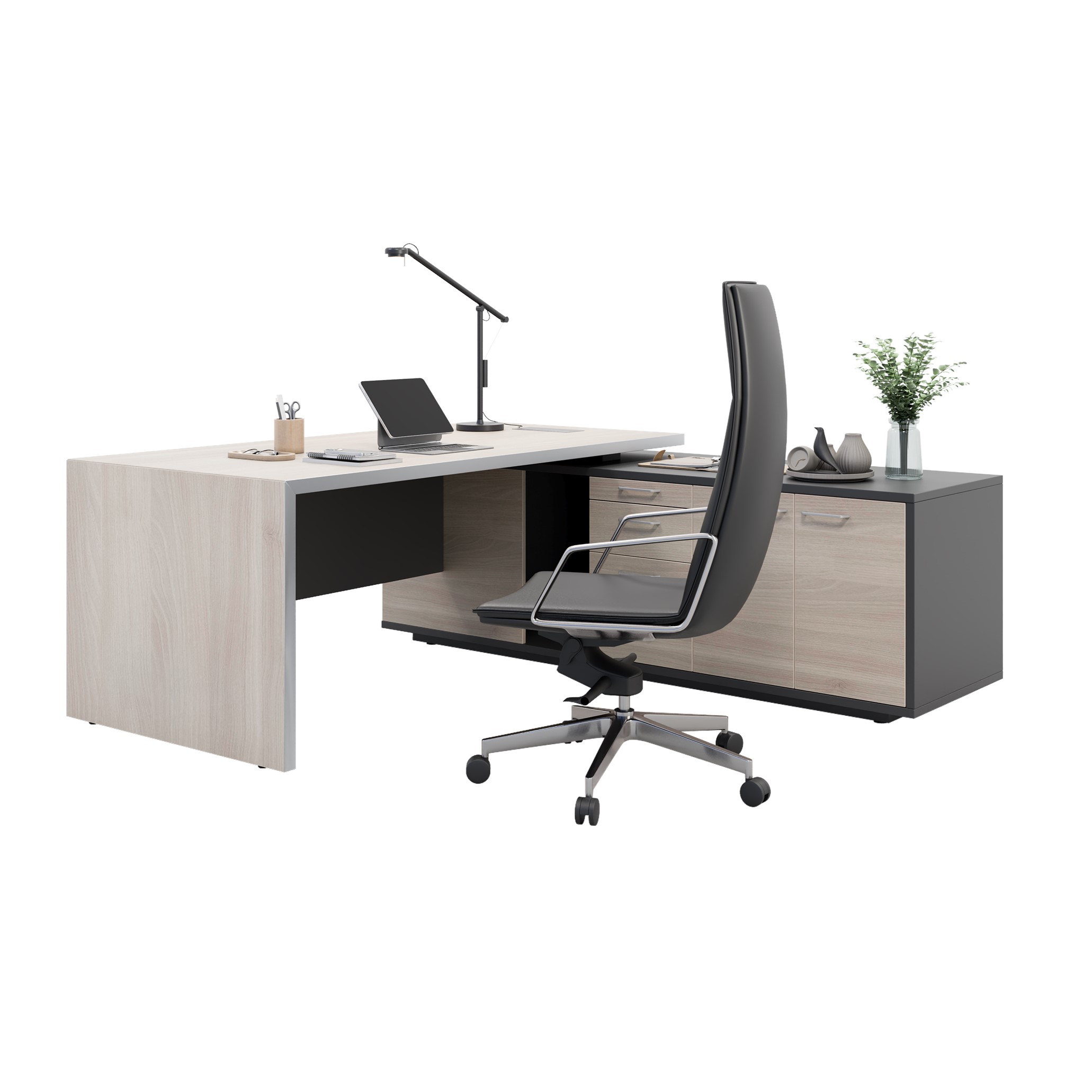 Legacy, a desk that is characterised by the strong lines & brushed aluminium PVC edging. The dropped L-etension with drawers makes it the ideal office desk for managers that need to keep documents close at hand.